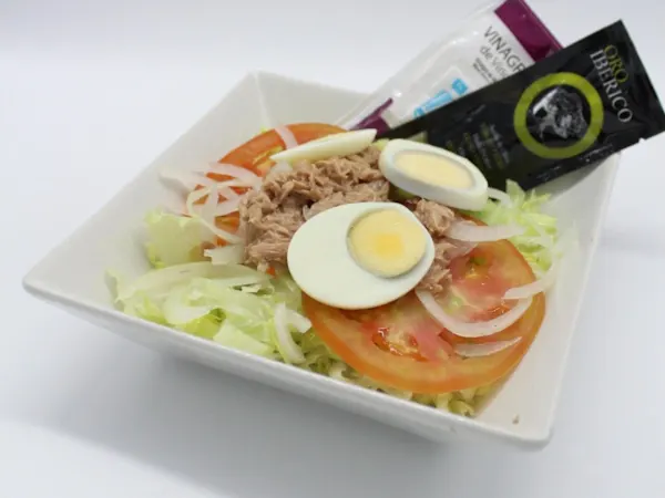 Lechuga, 3 tomates cherry, huevo, cebolla y atún.
