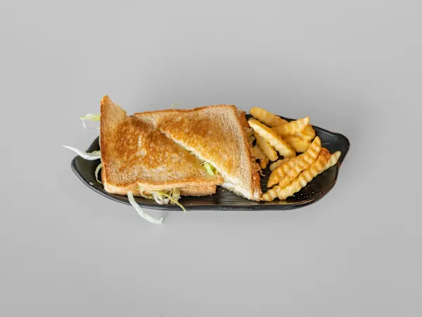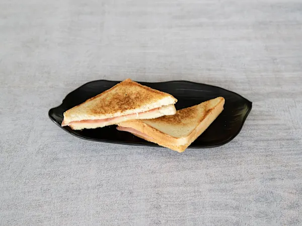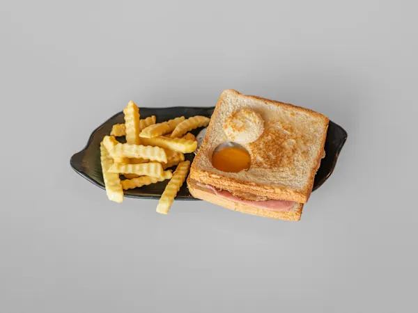Pan de molde, jamón york, queso y huevo frito.