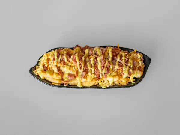 Patatas fritas, bacon, salsa ranchera y salsa de queso.