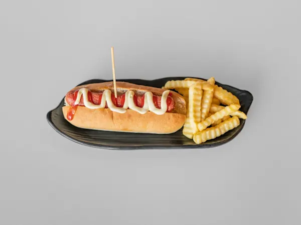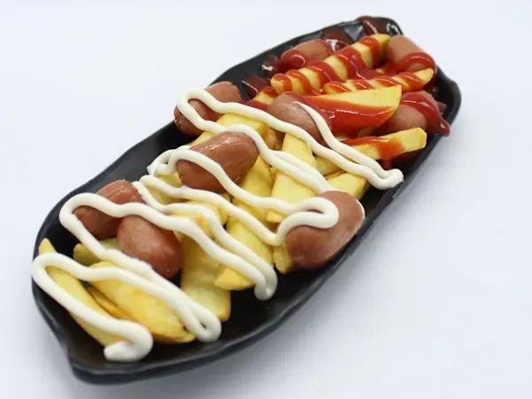 Patatas fritas, salchichas tipo cocktail, ketchup y mayonesa.