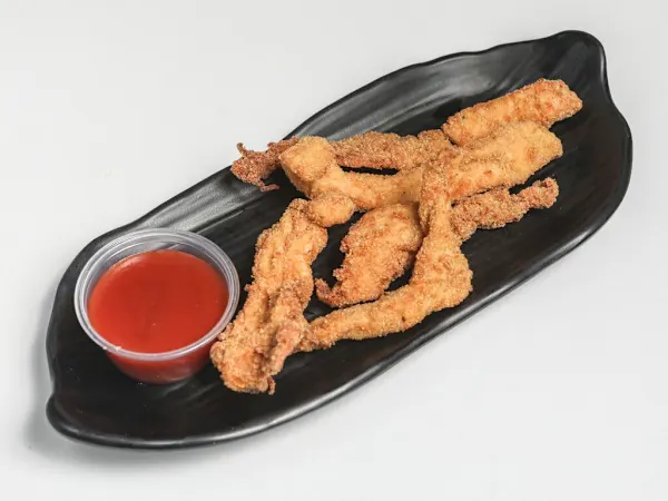 Tiras de pechuga de pollo empanadas, acompañadas de salsa ketchup.